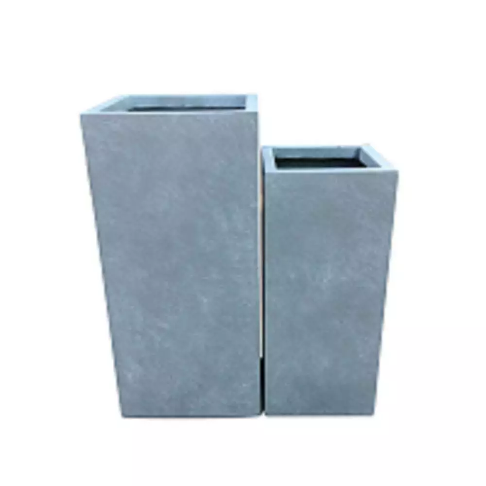 These elegant square planters have authentic concrete finish with visible pores make them beautiful contemporary pieces. The look and feel is true concrete but they weight substantially less than they look. They also have very smooth finish instead of rough concrete potters you might be used to. Their sizes are very generous and can hold a good amount of plants without looking crowded. It do have a more modern feel to them being straight lines and concrete. Would look great on apartment balcony or large backyard patio. Create a modern space using these tall wide planters. The straight lines and solid grey finish are a hot trend in modern landscape designs. Ideal for succulents and delicate plants that need room to grow. Made of lightweight concrete through an ecofriendly manufacturing process. This composite material has no ruber, plastic, and steel. This material has all the advantages of concrete such as strength, durability, weather and damage resistance. Materials involve cement and weather resistant.