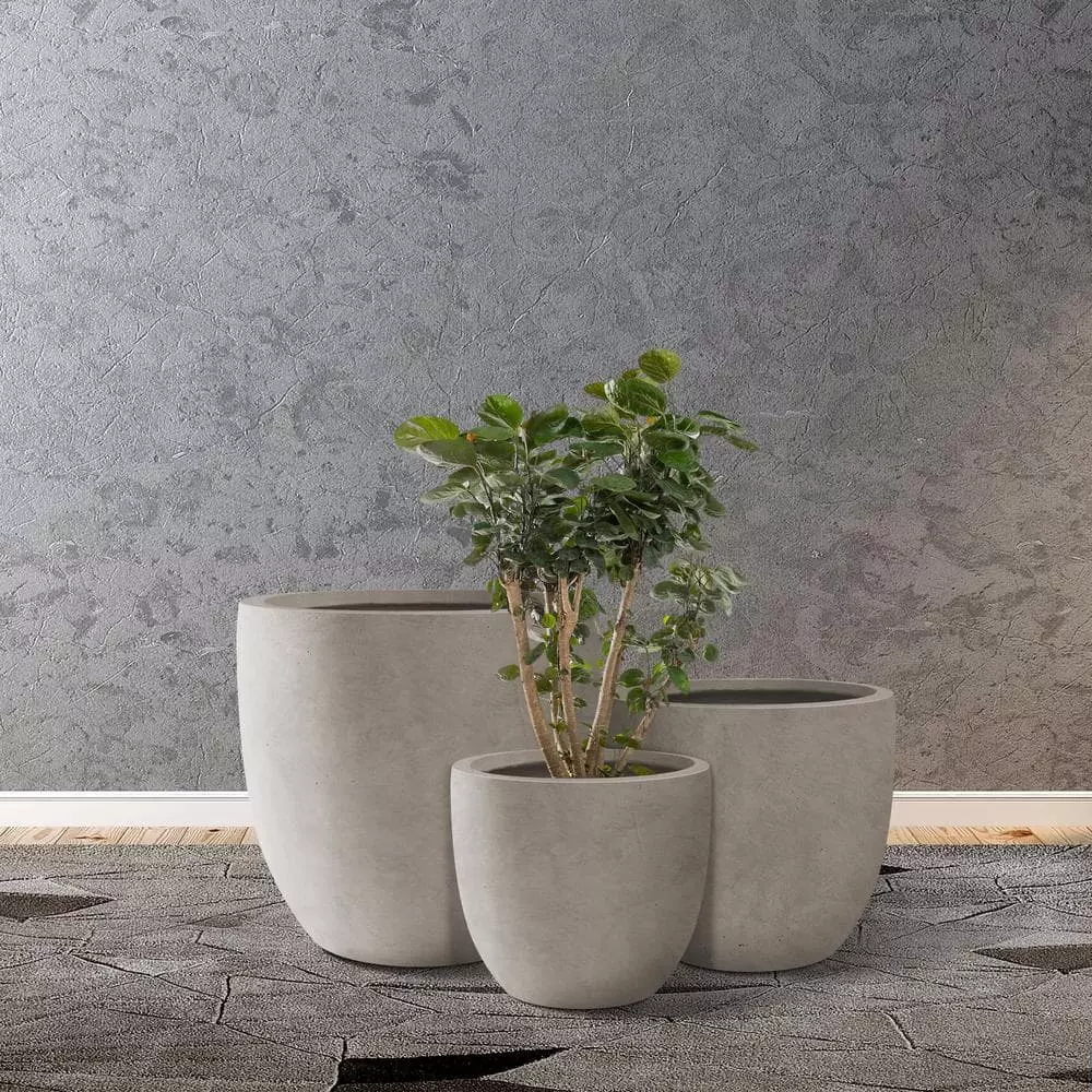 These elegant round planters have authentic concrete finish with visible pores making them beautiful contemporary pieces. The look and feel is true concrete but it weighs substantially less than it looks and makes it easier to move around, it is smooth instead of rough concrete potters you might be used to and will help you maintain a modern design throughout your space. The size is very generous and can hold a good amount of plants without looking crowded. Would look great on apartment balcony or large backyard patio, you can’t go wrong with the grey finish as it blends well with any decor, they can be used individually, as a set or in a row to promote unity. Made of lightweight concrete and weather-resistant fiberglass through an ecofriendly manufacturing process, it has all the advantages of concrete such as strength, durability, weather and damage resistance, strong UV resistant ability and stay well in wind, rain, hot and cold season.