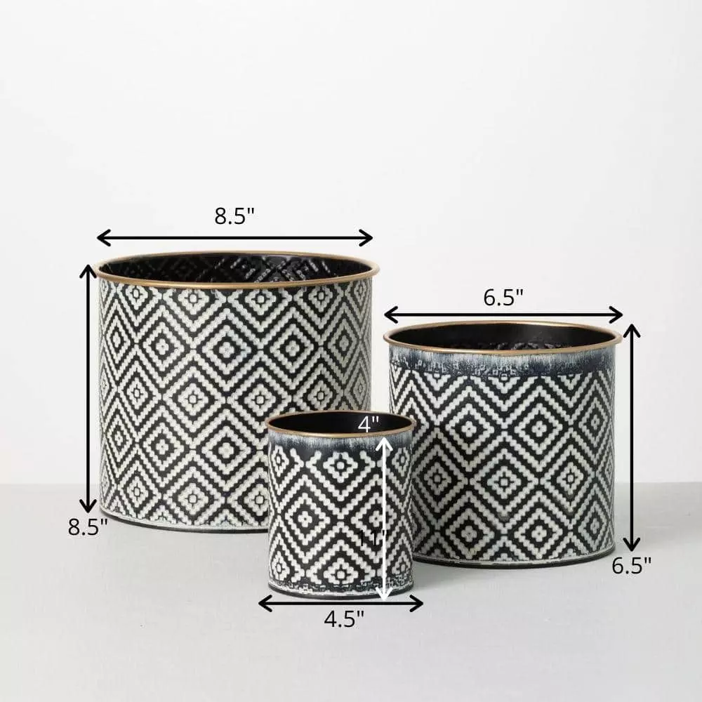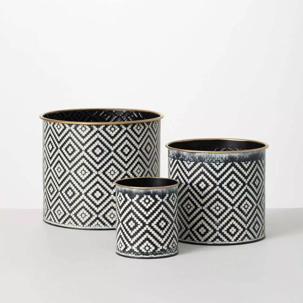 SULLIVANS Black and White Gemoetric Pattern Metal Planter (Set of 3) -Outdoor Plant Life black and white patterned sullivans plant pots met1828 4f 1000