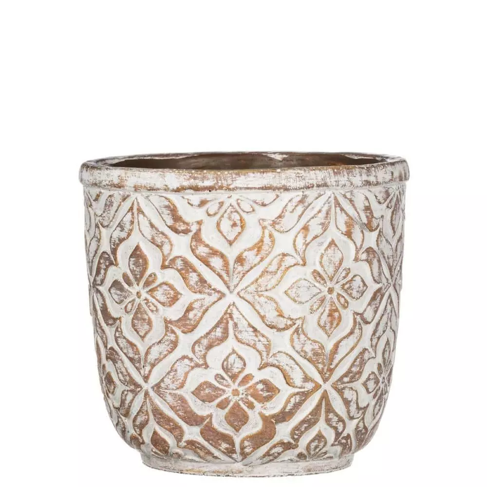 Etched with ornamental markings these cement containers serve as magnificent patio and garden planters. The distressed finish simulates clay pottery created by skilled artisans while the size and shape make them an ideal terra cotta solution for many uses. Terracotta clay and even concrete have unique properties of being sustainable safe durable and versatile enough for every style. Waterproof.