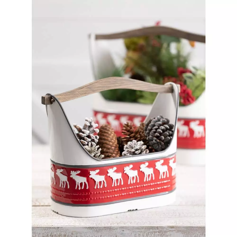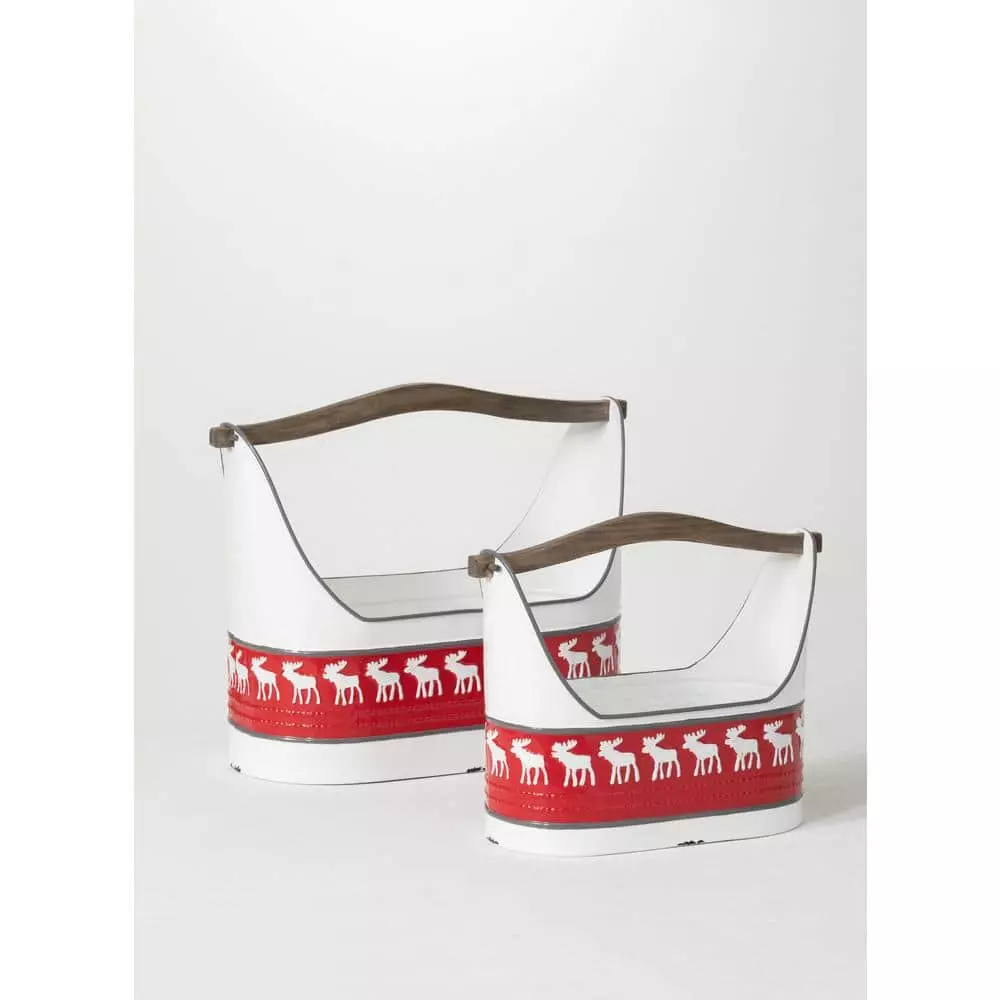 Stow away and store holiday greeting cards, party silverware, or even a bundle of fresh pine cones, for a look that is both festive and functional. White painted metal trugs with a red band of reindeer silhouettes is topped off with a wooden bent-shaped handle. They measure 10 in. and 13.5 in. in height. Over the last 52-years, Sullivans has become an industry leader in home decorations. Our brand is rooted in tradition while incorporating modernized trends to keep your home looking up to date with timeless style. Here at Sullivans, we pride ourselves on creating product designs focused on quality and value, ensuring that our customers have access to beautiful products at reasonable price points.