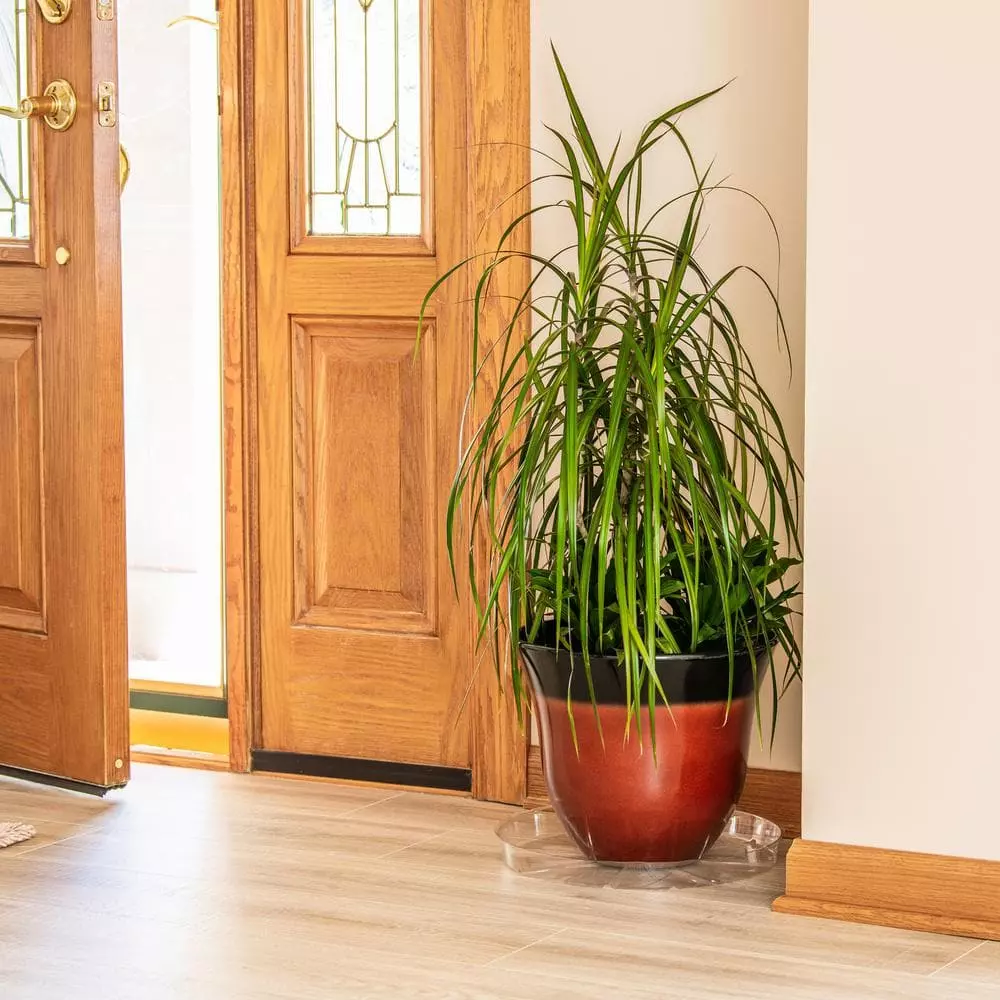 Clear saucer blends with ceramic, clay and plastic planters